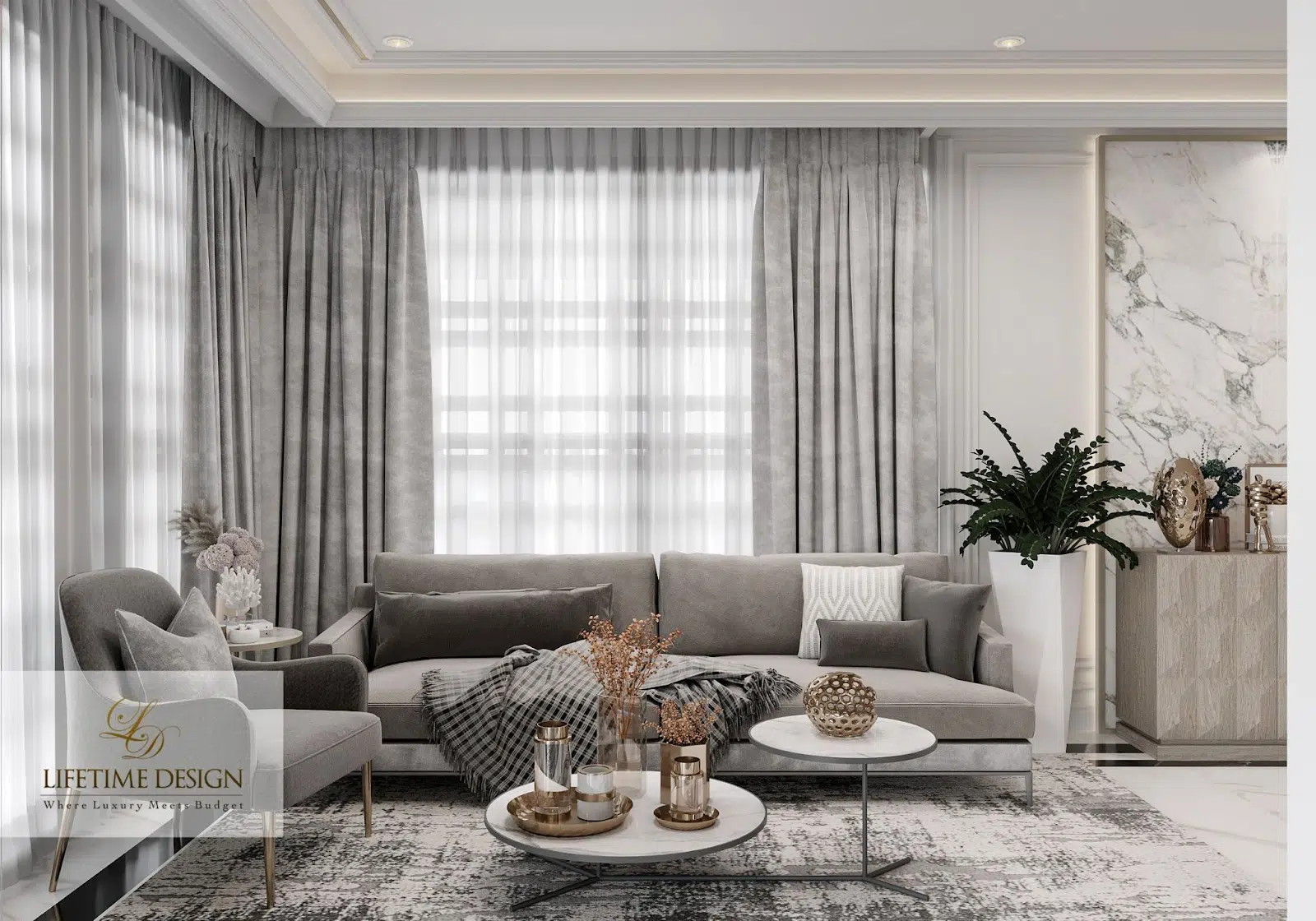 Furnitur dengan material seperti kaca, logam, dan kulit menjadi pilihan utama. Sofa besar dan kursi yang ergonomis menciptakan kenyamanan bagi anggota keluarga. Aksesori seperti karya seni abstrak dan karpet dengan pola geometris sering ditambahkan untuk memberi karakter.
