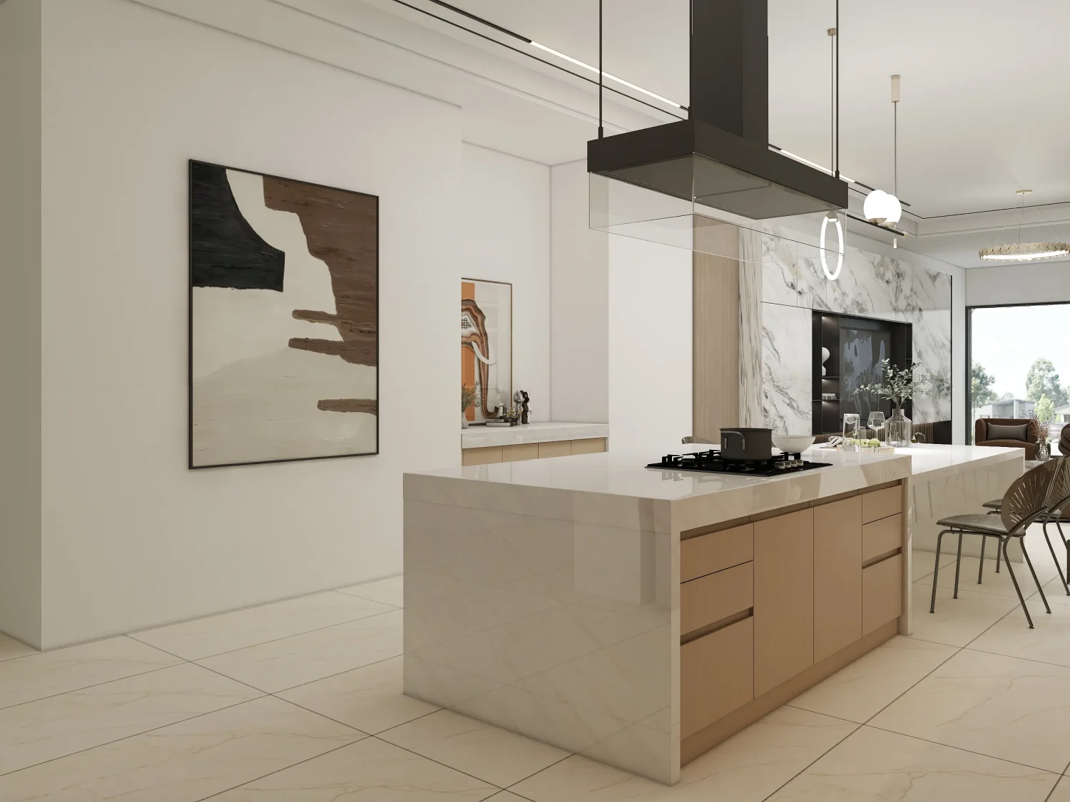 Lighting plays a critical role. Install layered lighting—recessed downlights, under-cabinet LEDs, and a statement pendant over the island—to define planes and emphasize materials.