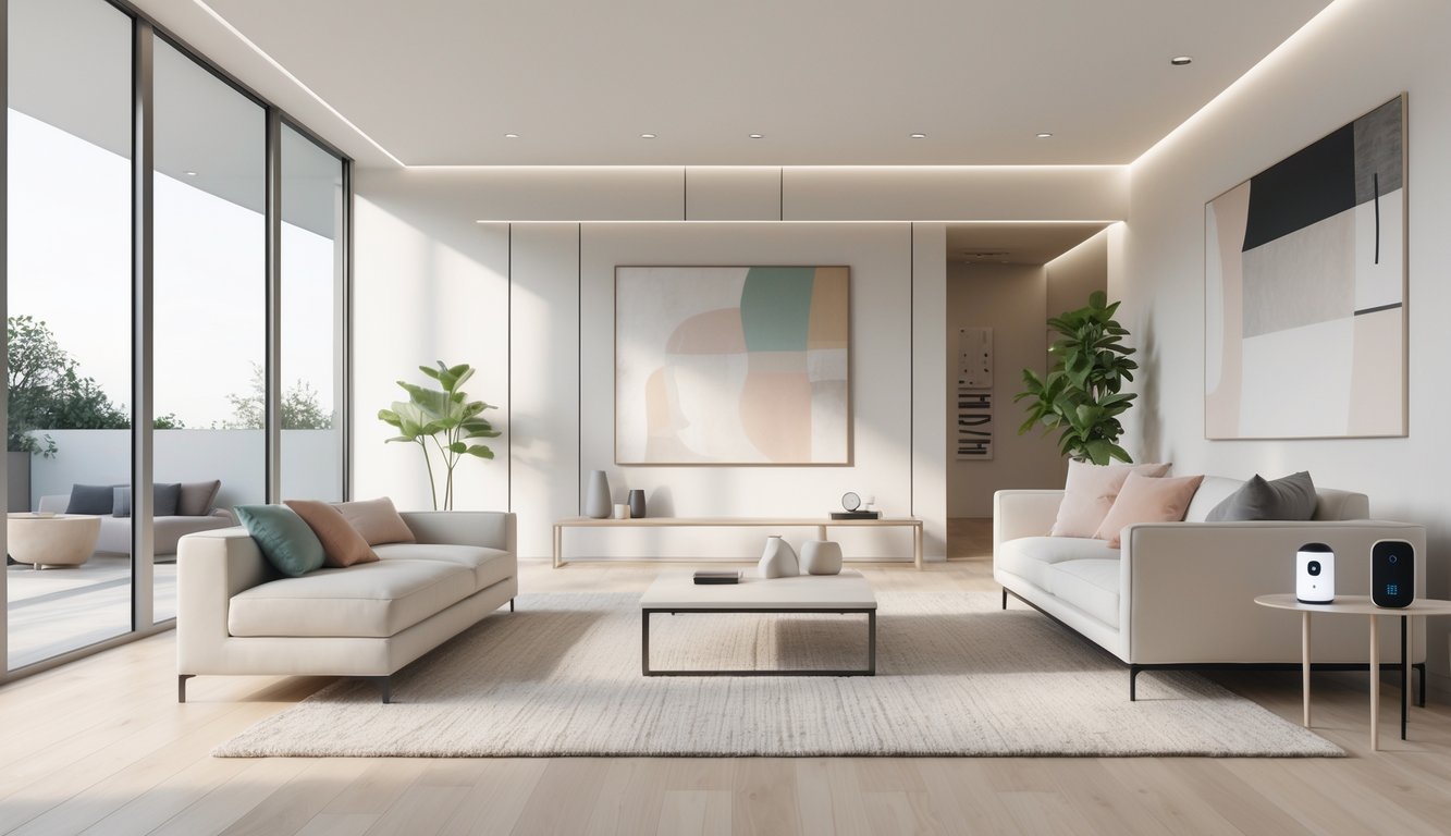 Warna netral seperti putih dan abu-abu mendominasi, memberikan kesan luas. Aksen kayu pada furniture menambah kehangatan, sementara tanaman hias kecil membawa nuansa alami.