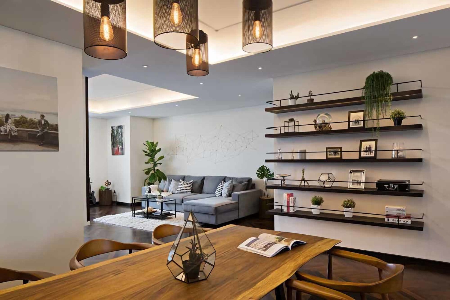 Menambahkan beberapa tanaman hias dalam pot berwarna pastel juga membantu menyeimbangkan tampilan ruangan. Dengan cara ini, dapur dan ruang makan tidak hanya nyaman, tetapi juga menarik secara visual.