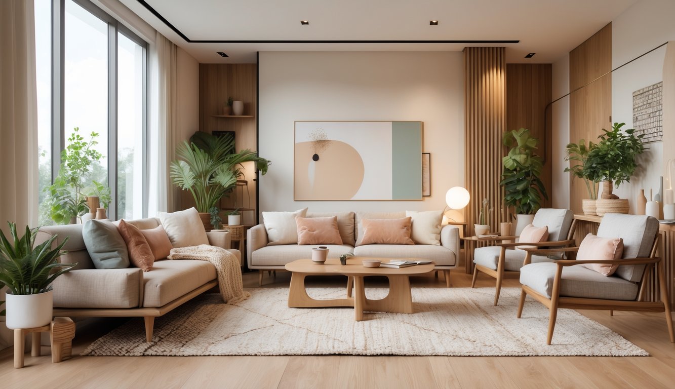 Ruang tamu dengan gaya ini sering dilengkapi dengan tekstur lembut, seperti carpet wol dan bantal berwarna pastel. Selain itu, keberadaan tanaman indoor memberikan kesan sejuk dan segar. Pemilihan furnitur multifungsi juga mendukung fungsionalitas ruang, menjadikannya ideal untuk berbagai aktivitas.