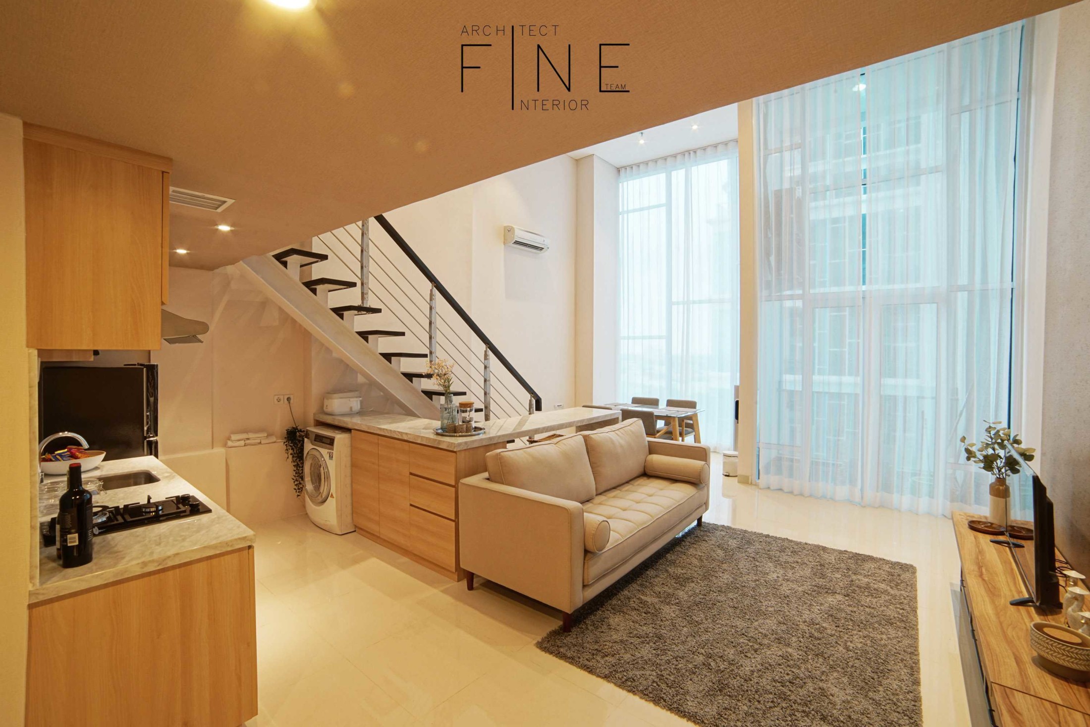 Kombinasi keduanya memungkinkan penciptaan ruang yang seimbang, dengan fokus pada material alami seperti kayu.