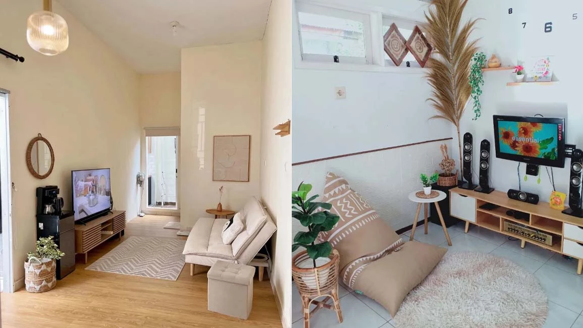 Perabotan dengan desain minimalis, seperti sofa rendah dan meja kayu ringan, memberi kenyamanan tanpa mengorbankan keanggunan. Aksesori seperti bantal berbulu, keranjang anyaman, dan tanaman hijau menambahkan sentuhan kehangatan.